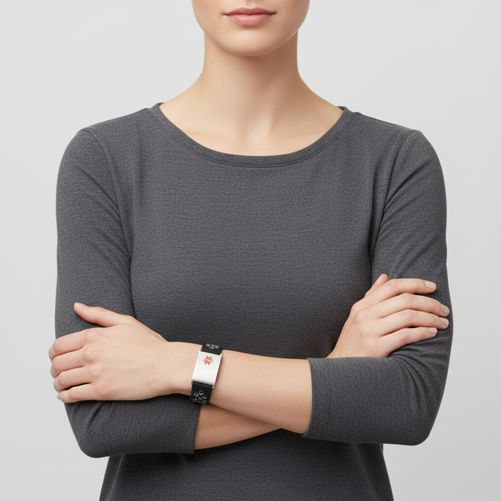It’s waterproof, lightweight, and secures with a pin-tuck closure to fit most adult wrists (6–8”). A great choice for active living and dependable medical identification.