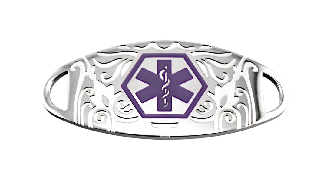 Stylish and durable, this stainless steel tag features intricate scrollwork and a bold purple medical emblem for clear visibility in emergencies. Designed to pair with any of our interchangeable bands, it's the perfect blend of safety and style.