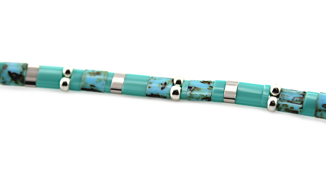 - Turquoise & palladium plated tila beads with galvanized silver seed beads