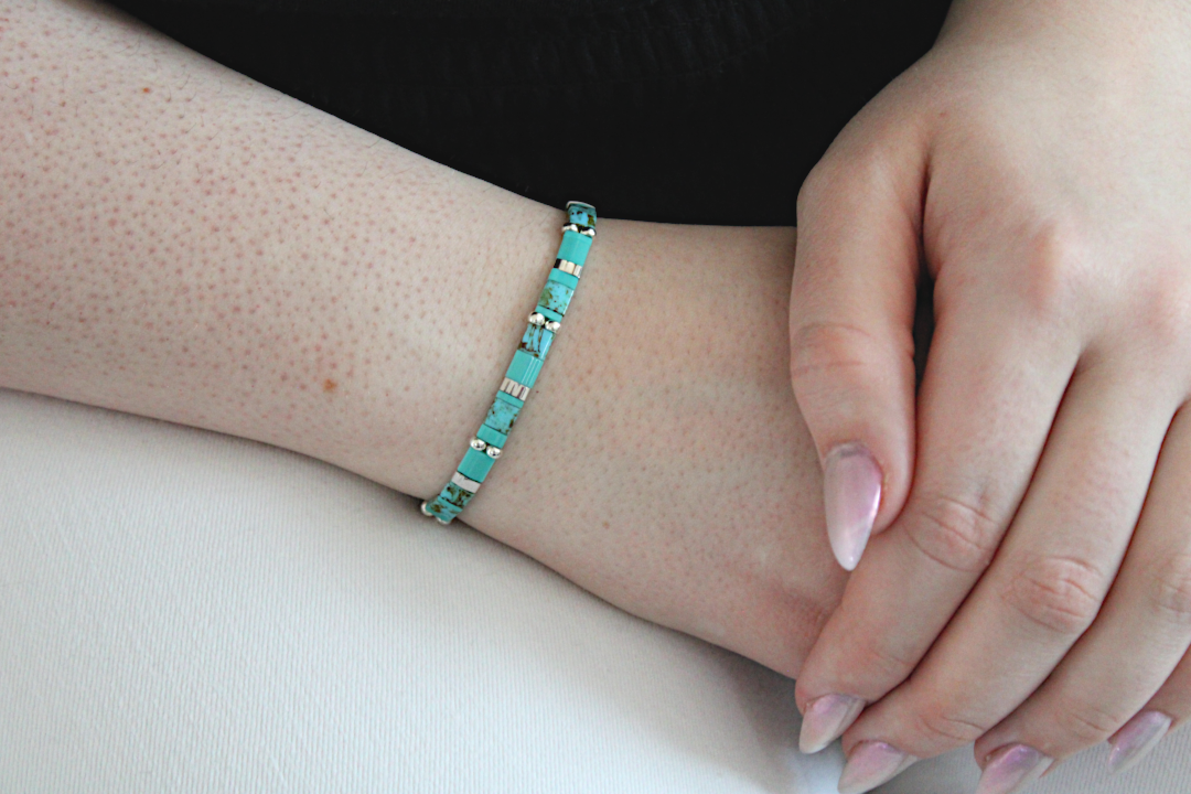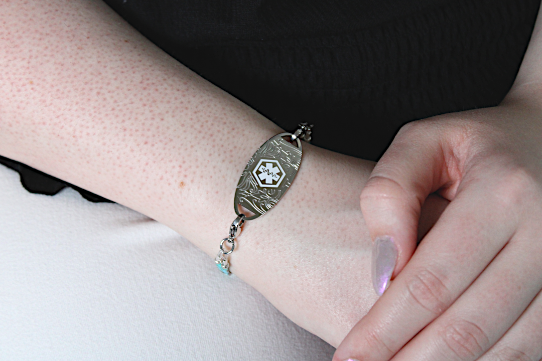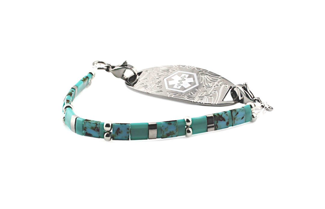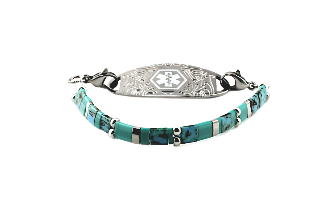 Infused with the calming hues of the Southwest, the Sedona Sky Stretch Medical ID Bracelet in Silver, features lightweight turquoise and silver tila beads accented with gleaming silver seed beads. Designed as a stretch bracelet, it offers easy on-and-off wear—no clasps, no hassle. The soft blend of natural tones and clean metallics brings a serene yet stylish touch to your everyday look. Pair it with your favorite medical ID tag (sold separately), custom engraved with your vital information to speak for you in an emergency. Whether you're at work, exploring nature, or spending time with loved ones, this bracelet is both beautiful and potentially life-saving.